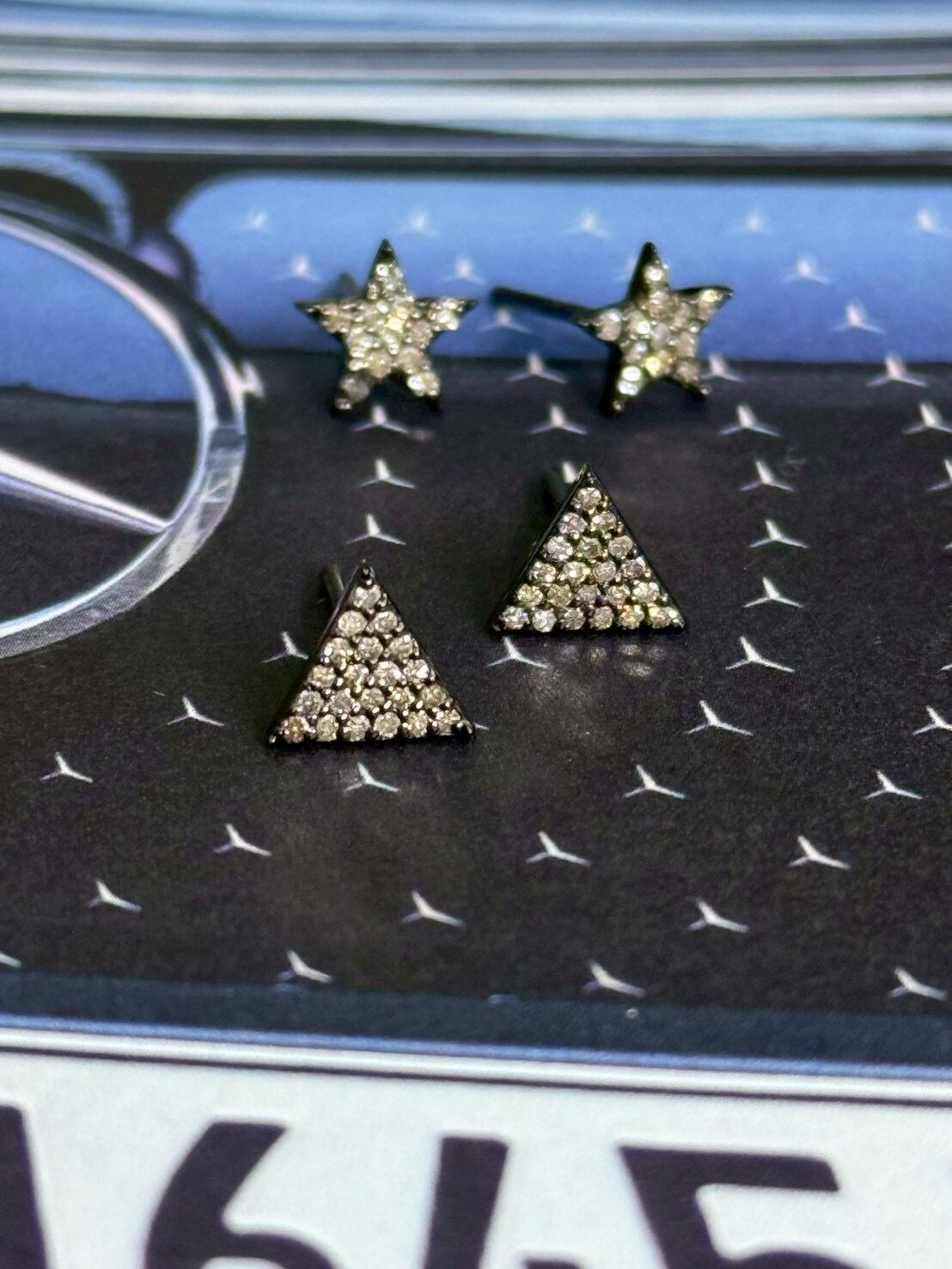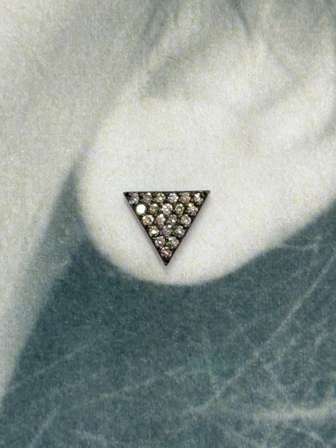 「トライアングル」 人と違うものをセレクトしたい...だからこそのモチーフです。 chicのダイヤモンドは「ナチュラルダイヤ」 今回のコレクションはブラウンダイヤモンドです♪ ブラウンの輝きはどこか上品であり、 ブラックコーティングで個性をだすコレクション。 「トライアングル」は個性的に。 素材:sirver925/K18BGコーティング Stone: ブラウンダイヤ 全体 縦×横:約0.7cm