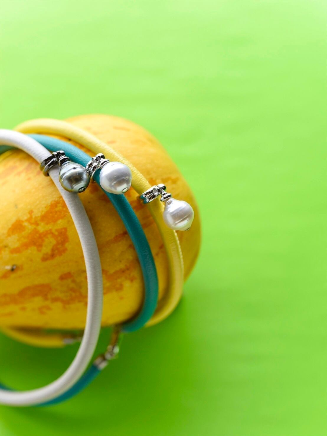 パールとレザーのコンビネーションは、とってもオシャレです。