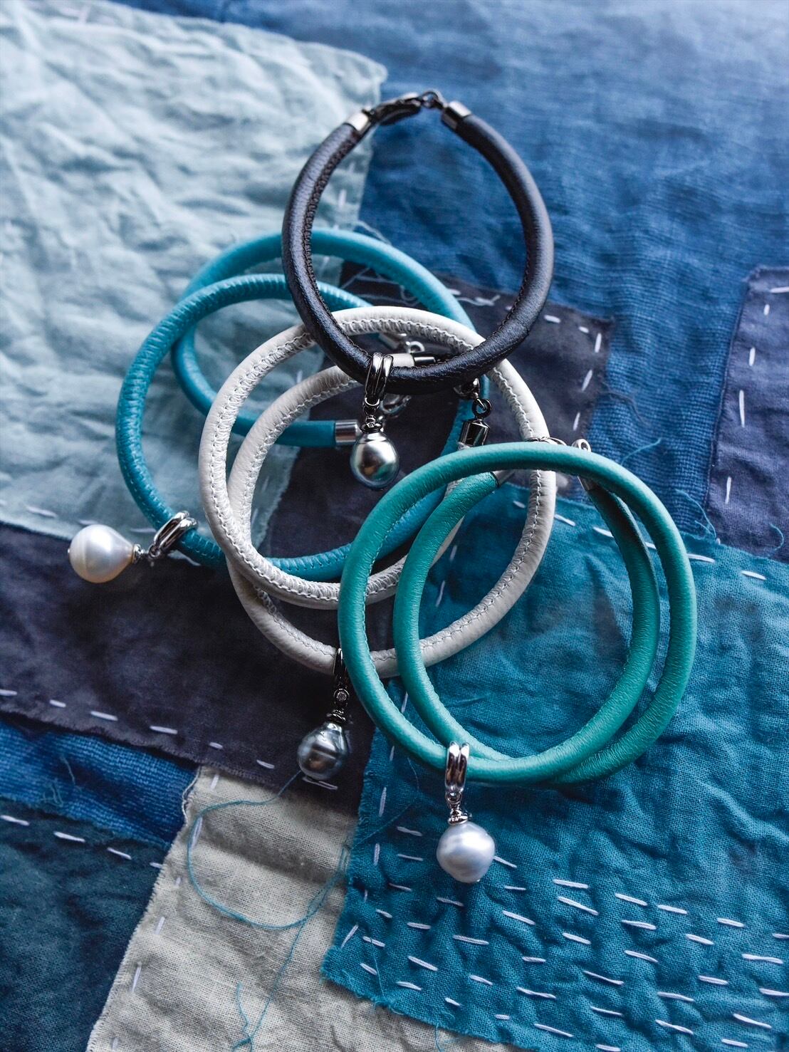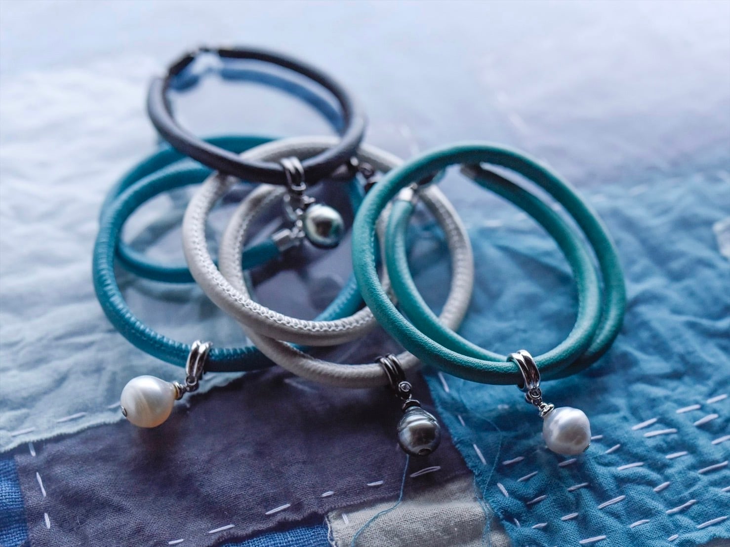 パールとレザーのコンビネーションは、とってもオシャレです。