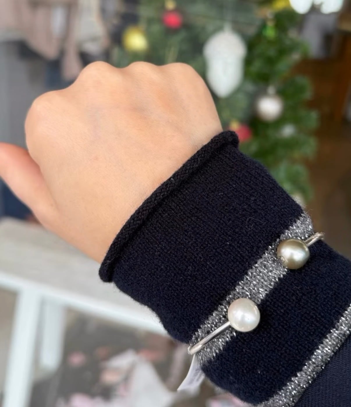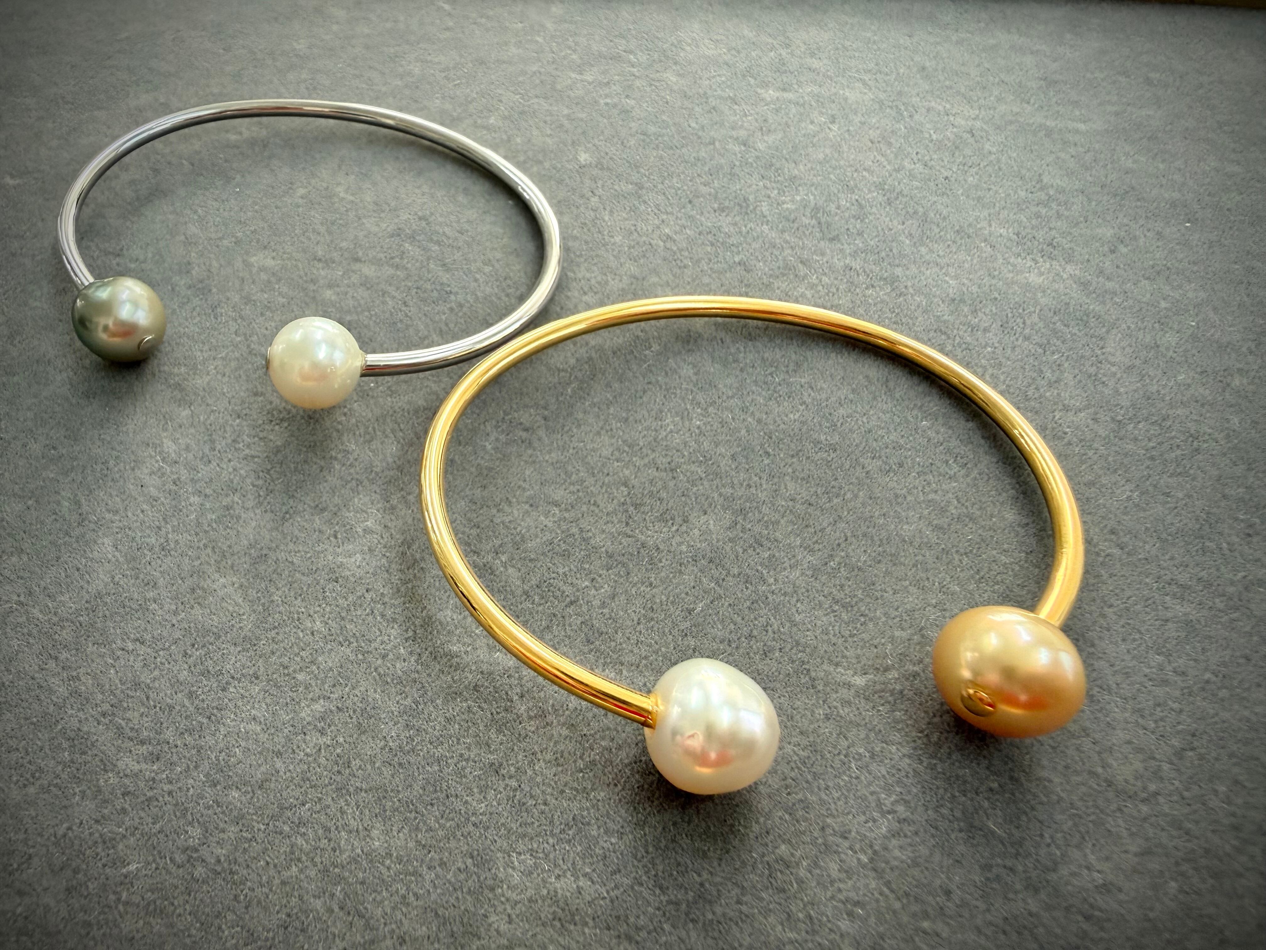 パールを日常に、そして上品カジュアルとしてつけてもらいたい、そんな願いと共にデザインしたバングル。 ホワイトの南洋パールに、タヒチのブラックパールやゴールデンパールとのコンビネーションが素敵です。 ブラックパールの中でもピスタチオに近い天然パールを使用。 冬はニットの上からでも本当に可愛いです。 夏はバングルと共にブレスの重ね付けもオシャレにつけてもらえますよ。 素材:SV925・K18YG.WGコーティング パール 10mm
