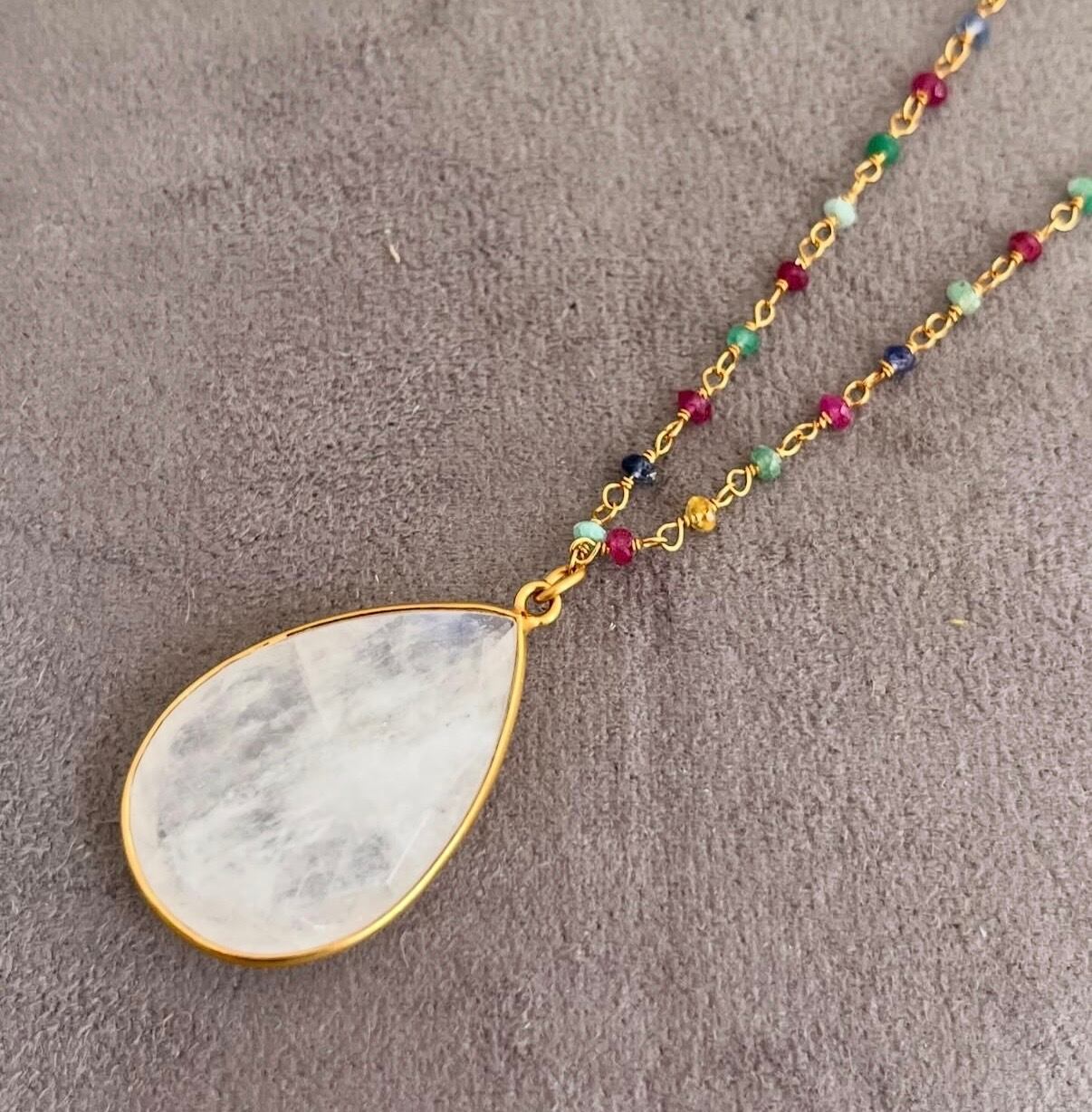 マルチサファイアの美しい色合いが楽しめるネックレス。 一つ一つ手で留めてあるビーズカットサファイアに、 優しい色合いのムーンストーンがマッチした素敵なネックレスです。 素 材:SV925・18K/YGコーティング 天然石:マルチサファイア/ムーンストーン サイズ:全長:60cm ムーンストーン 縦:約3.5cm 横:約2cm