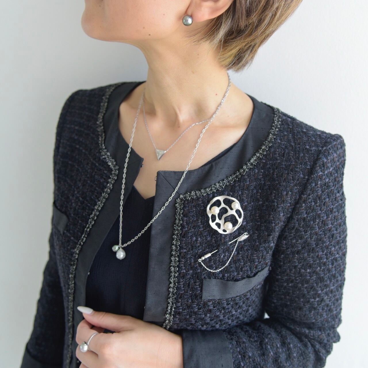 マット素材とエレガントなパールの組み合わせが、とってもおしゃれでモダンなブローチ。 普段使いはもちろん、オケージョンにも使えて、チェーンを通すとさらにネックレスとしても使えます☆ ※チェーンは別売りです 素材:silver925/K18WGPコーティング アコヤ真珠8mm×3個